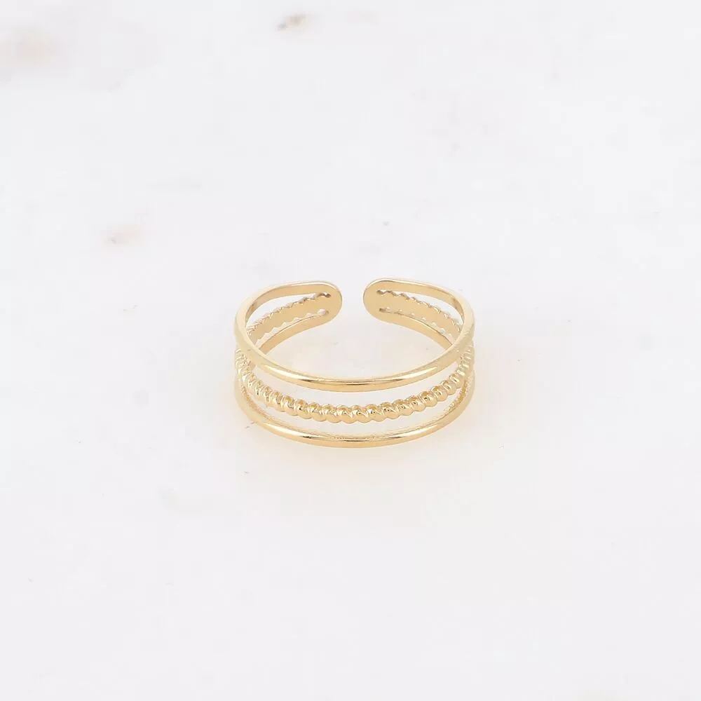 Bague en acier inoxydable composée de trois anneaux dont un torsadé.
