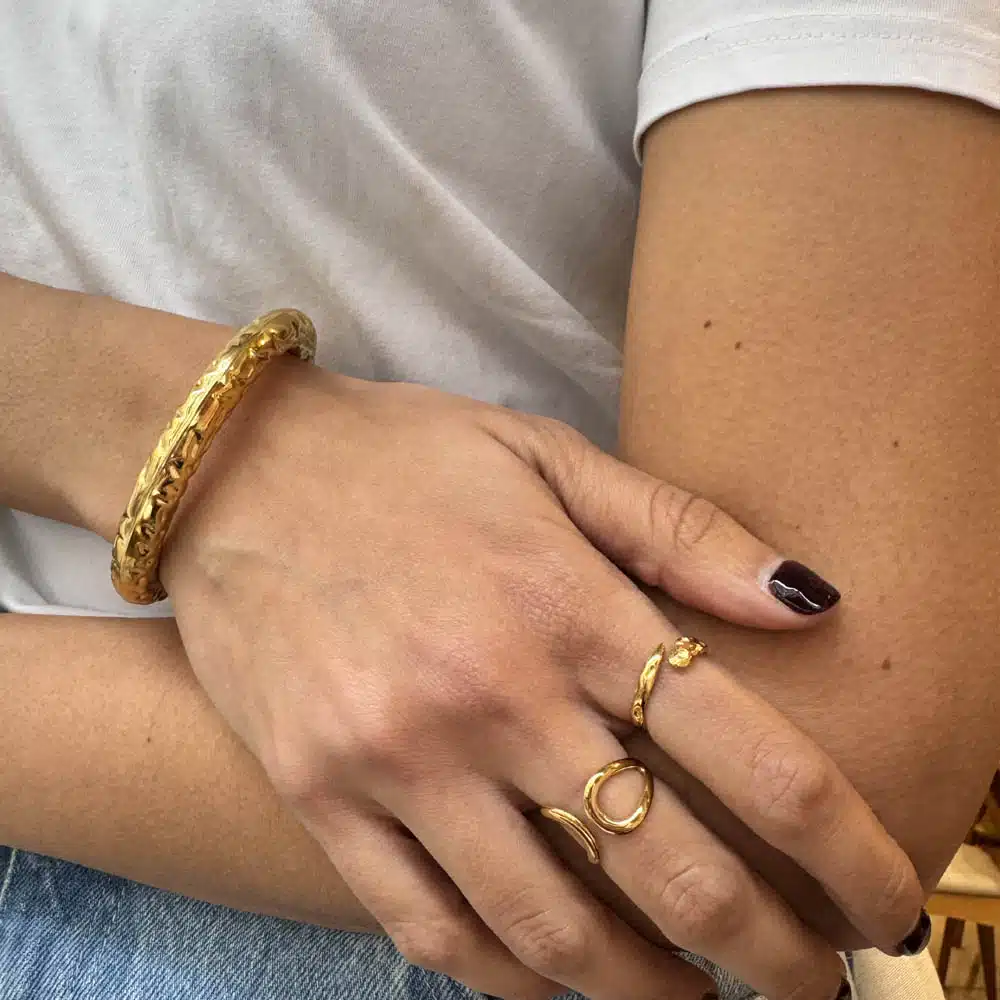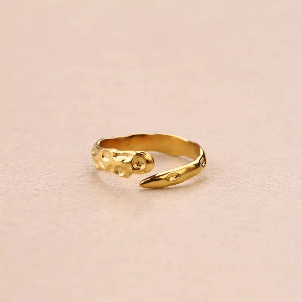 Bague ajustable en acier inoxydable doré, présentant un anneau ouvert au design irrégulier et une surface texturée par des empreintes martelées.