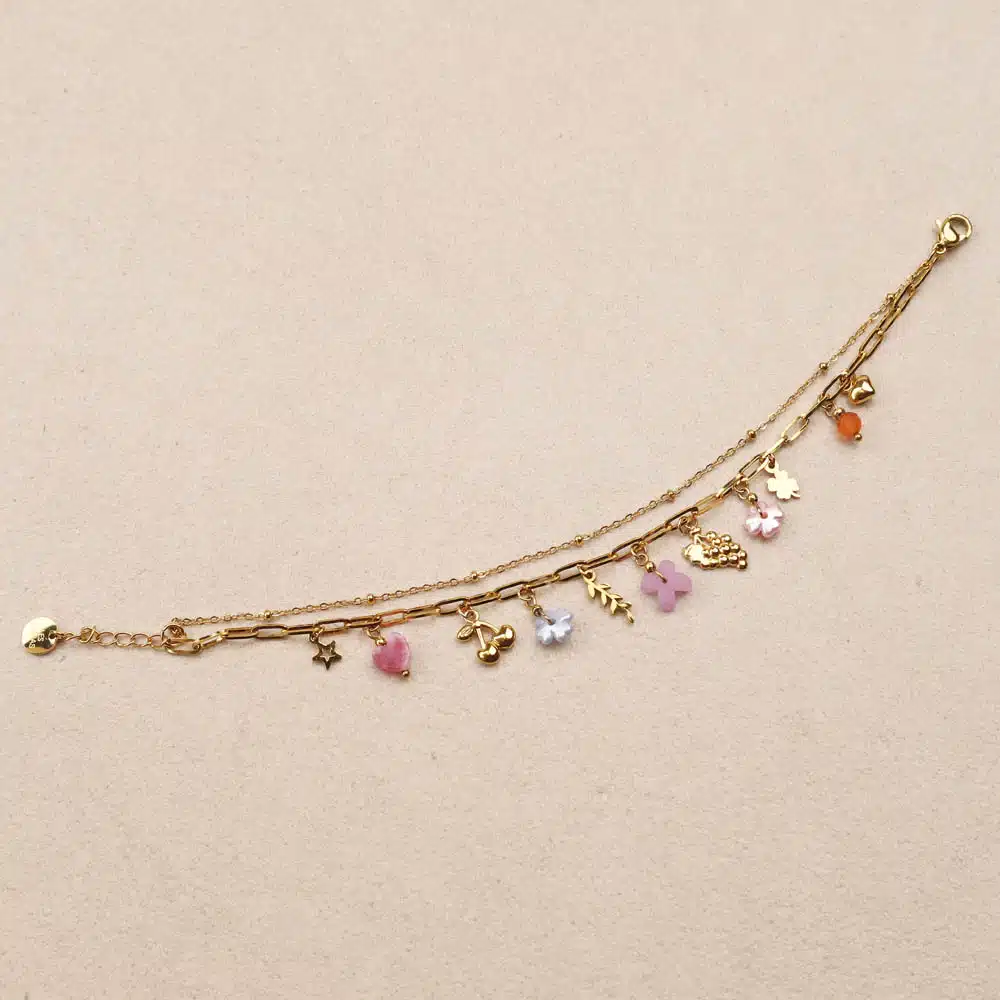 Bracelet double rang en acier inoxydable doré mixant une chaîne satellite perlée et une chaîne à grands maillons rectangulaires rythmée par des amulettes figuratives, longueur 16 cm + 3 cm de rallonge.