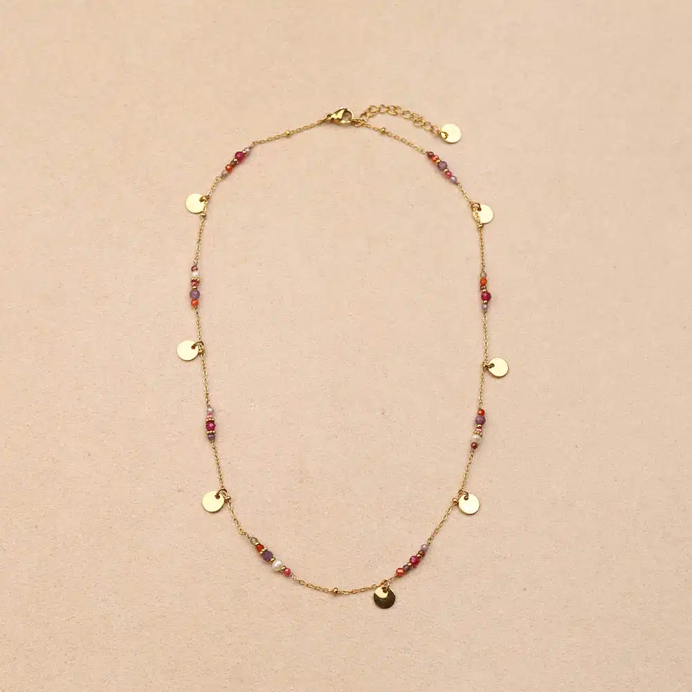 Collier Elenya en acier inoxydable doré, orné de fines perles violettes, rose, blanc nacré et de petites pastilles dorées délicatement réparties sur la chaîne. Fermoir mousqueton avec chaîne d’extension. Longueur : 38 cm + 4 cm de chaîne d’extension.