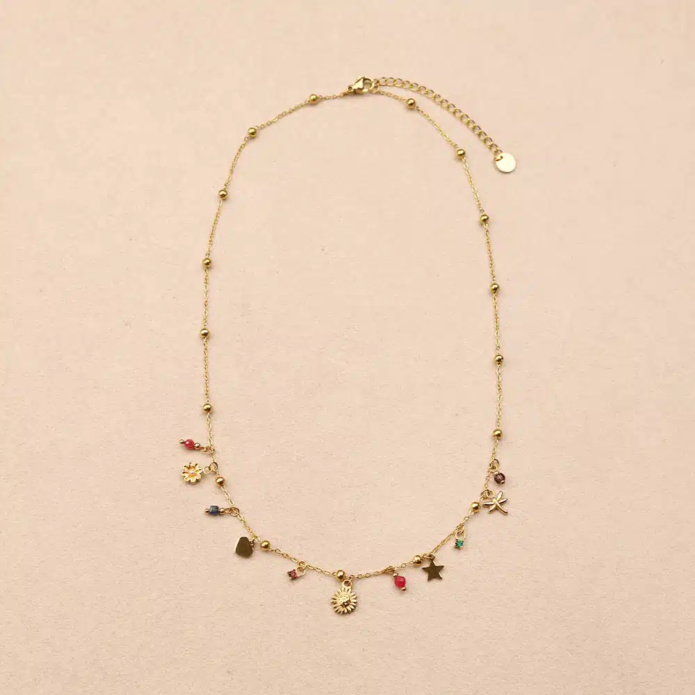 « Collier Lioranne en acier inoxydable, composé de boules dorées tout au long, agrémenté de perles rose, vert, marron et bleu ainsi que de petits charms en forme de fleurs, cœur, étoile et libellule.