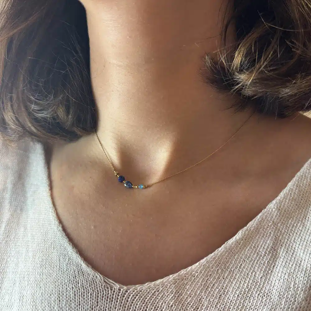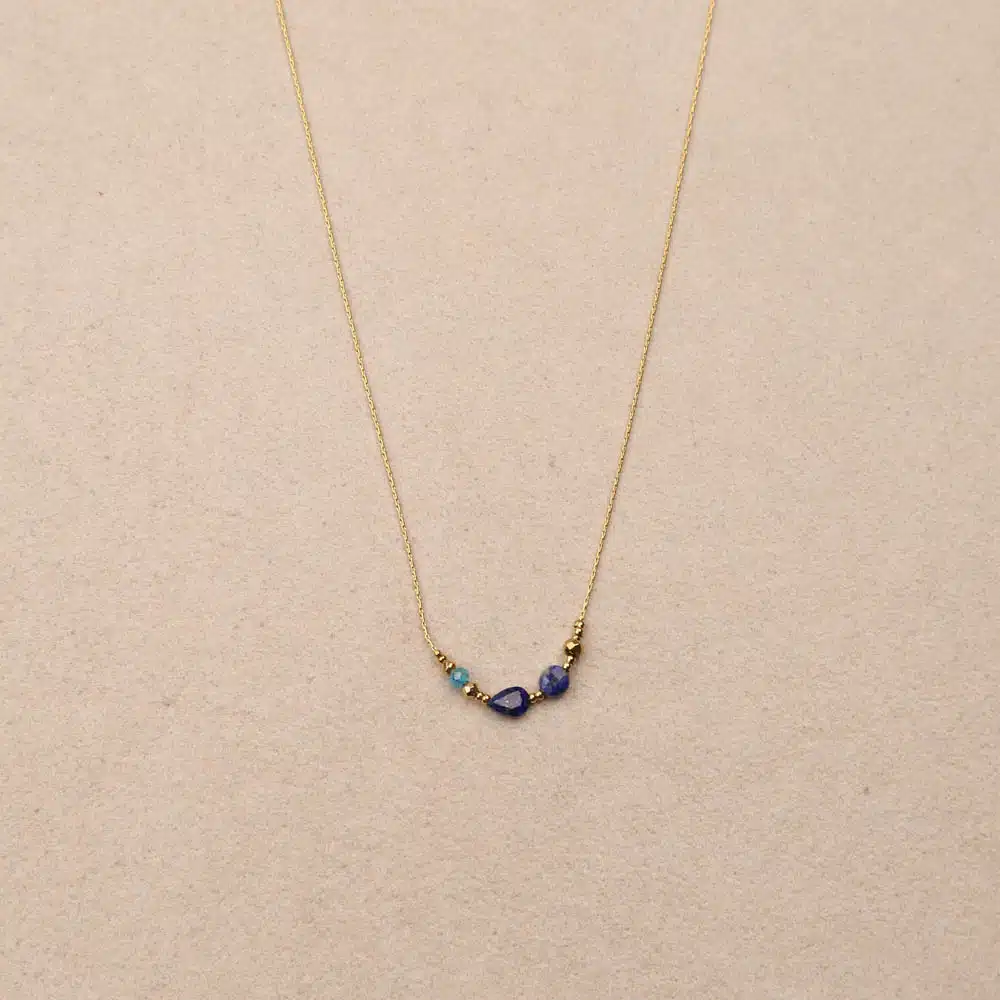 Collier Philomène en acier inoxydable doré avec trois pierres naturelles Lapis-lazuli de formes variées, perles dorées et chaîne fine, longueur 40 cm plus 4 cm de chaîne d’extension.