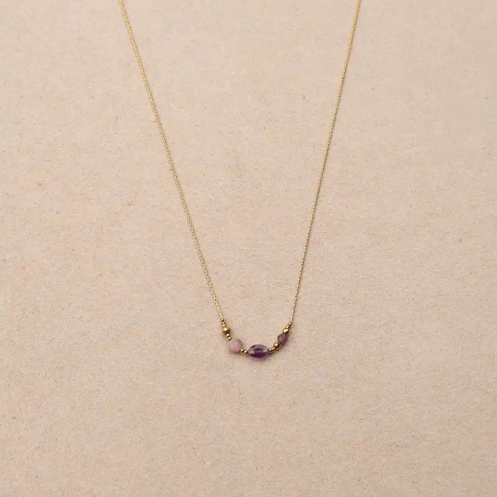 Collier Philomène en acier inoxydable doré avec trois pierres naturelles violettes de formes variées, perles dorées et chaîne fine, longueur 40 cm plus 4 cm de chaîne d’extension.