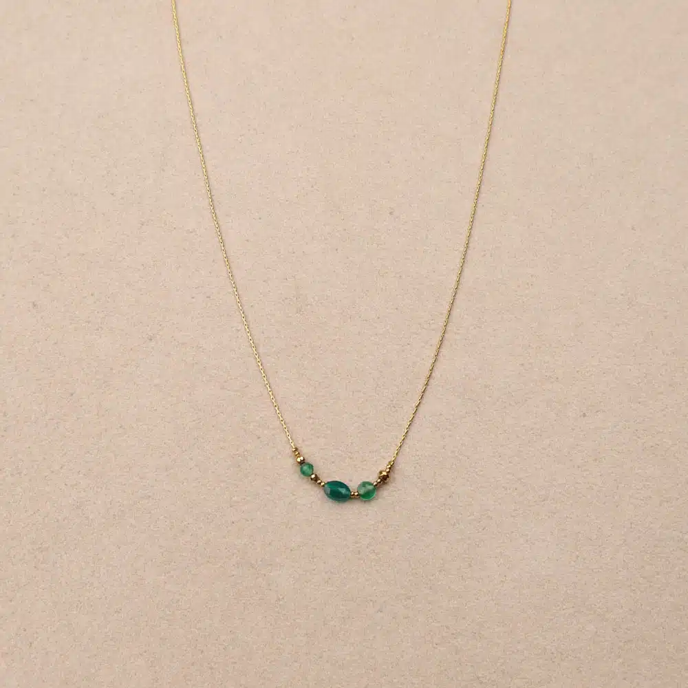 Collier Philomène en acier inoxydable doré avec trois pierres naturelles fluorite verte de formes variées, perles dorées et chaîne fine, longueur 40 cm plus 4 cm de chaîne d’extension.