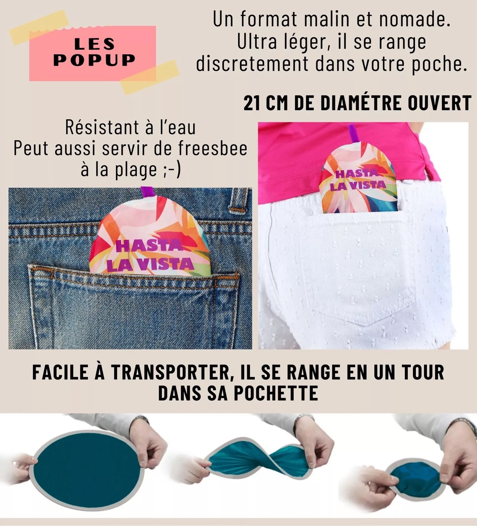 Un format malin et nomade. Ultra léger, il se range discretement dans votre poche. Résistant à l’eau Peut aussi servir de freesbee à la plage 😉 21 cm de diamétre » > Ingénieux > Pratique > 100 % polyester > Pochette de rangement avec pression de fermeture et boucle d’attache