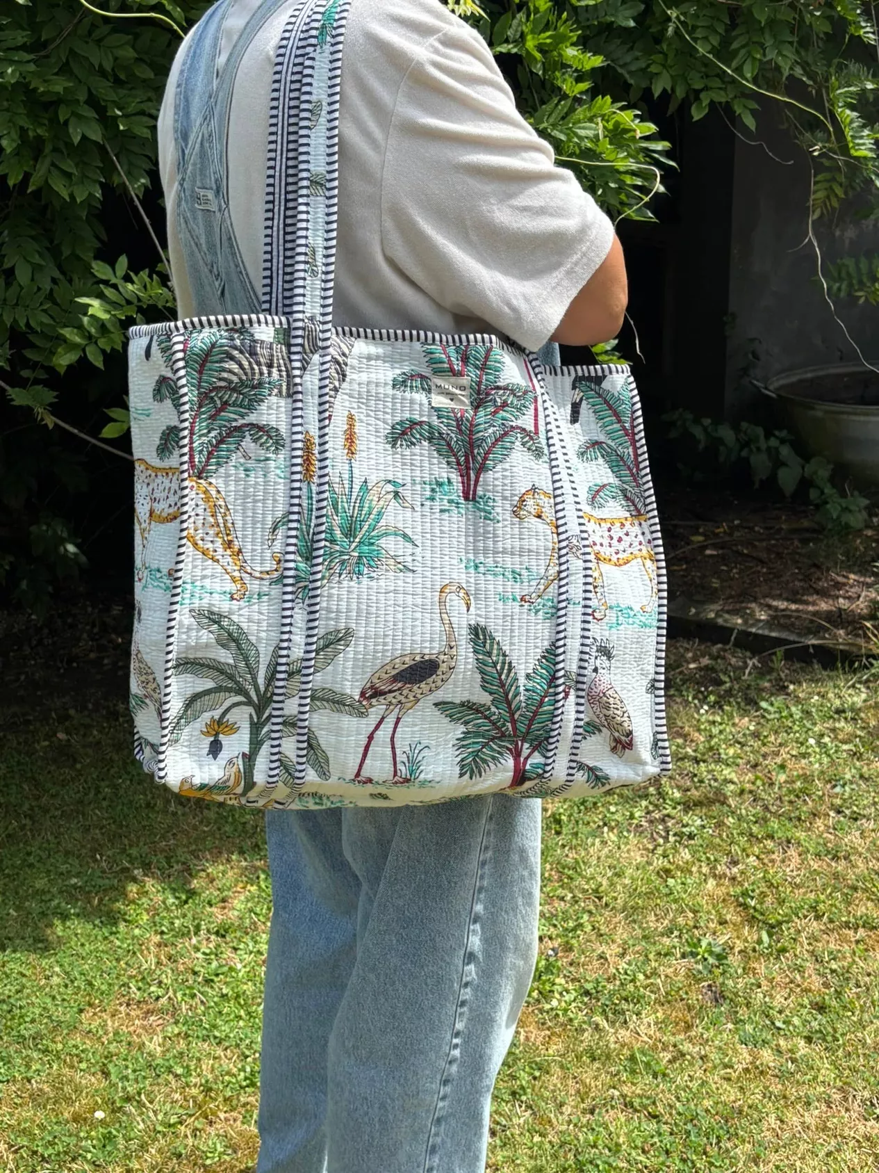 Confectionné en 100 % coton, ce spacieux cabas matelassé se distingue par son superbe imprimé jungle dessiné à la main sur fond écru. Des finitions à rayures noir et blanc soulignent les contours du sac et ses longues anses, créant un contraste moderne et élégant avec le motif naturel. Le design, à la fois ludique et raffiné, évoque l’aventure et la beauté de la nature.