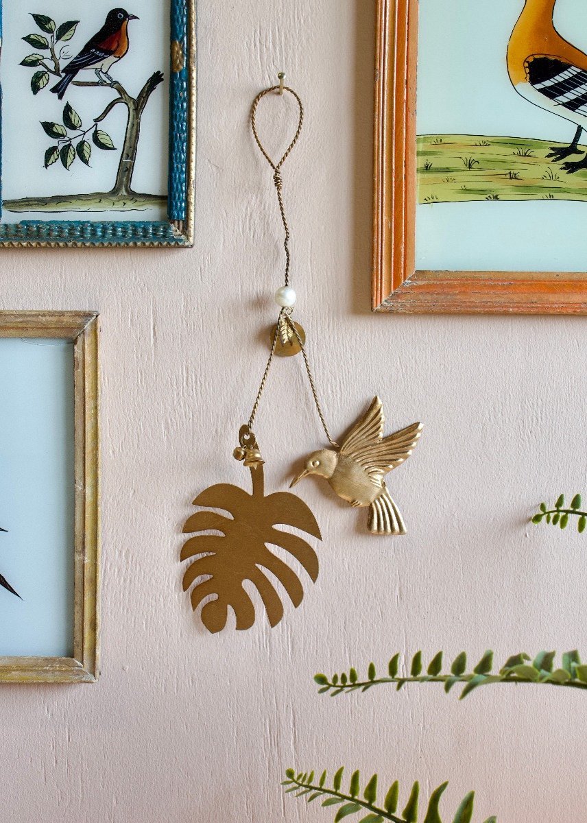 Élégant pendentif en métal fait main avec oiseau et feuille.
