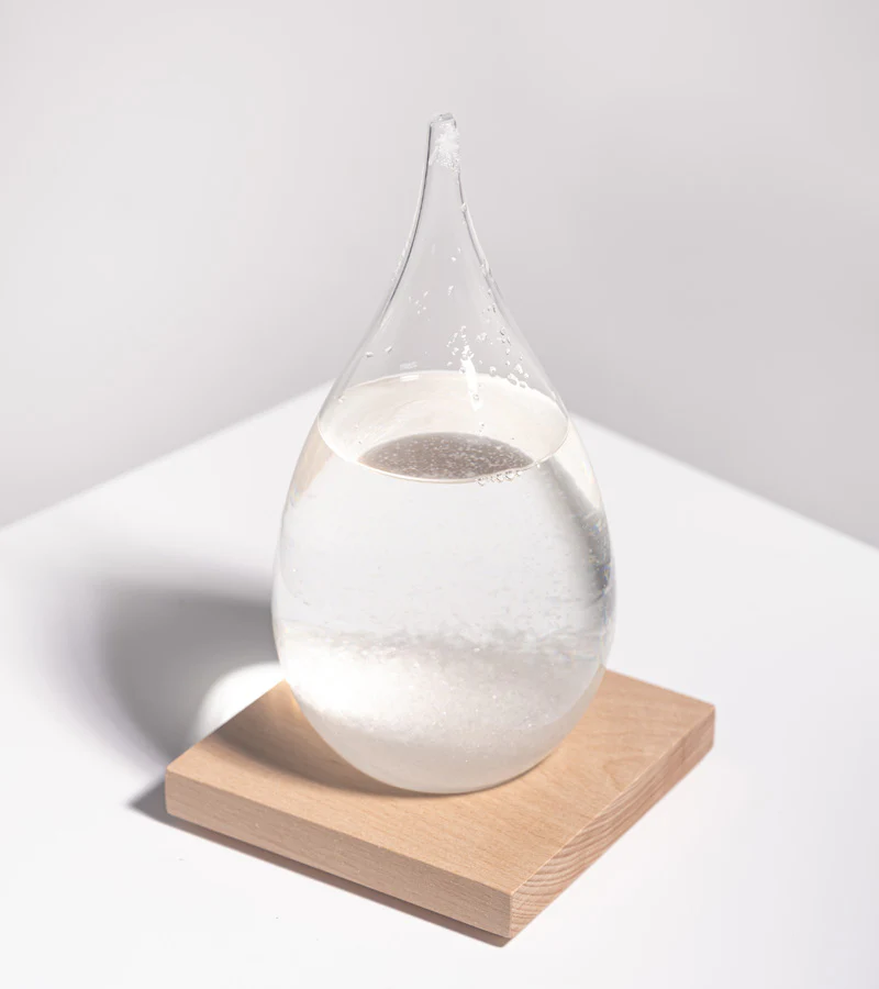 Un outil fascinant utilisé depuis les années 1750 par les voyageurs en bateau et même par Charles Darwin ! Le Storm glass, baromètre à cristaux prédira mystérieusement le temps : des cristaux visibles signifient un temps humide et brumeux, un verre nuageux avec de petits cristaux vous dira qu’un orage est en route et un verre clair signifiera un temps clair.