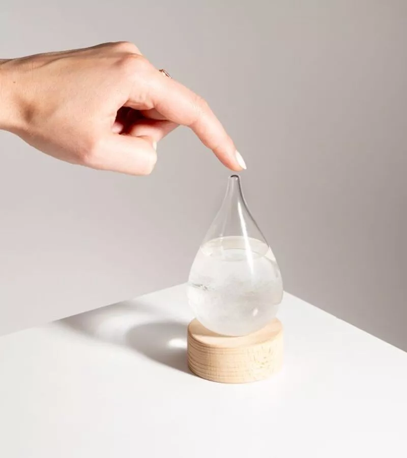Le baromètre à cristaux est un outil fascinant utilisé depuis les années 1750 par les voyageurs en bateau et même par Charles Darwin ! Il prédira mystérieusement le temps : des cristaux visibles signifient un temps humide et brumeux, un verre nuageux avec de petits cristaux vous dira qu’un orage est en route et un verre clair signifiera un temps clair.