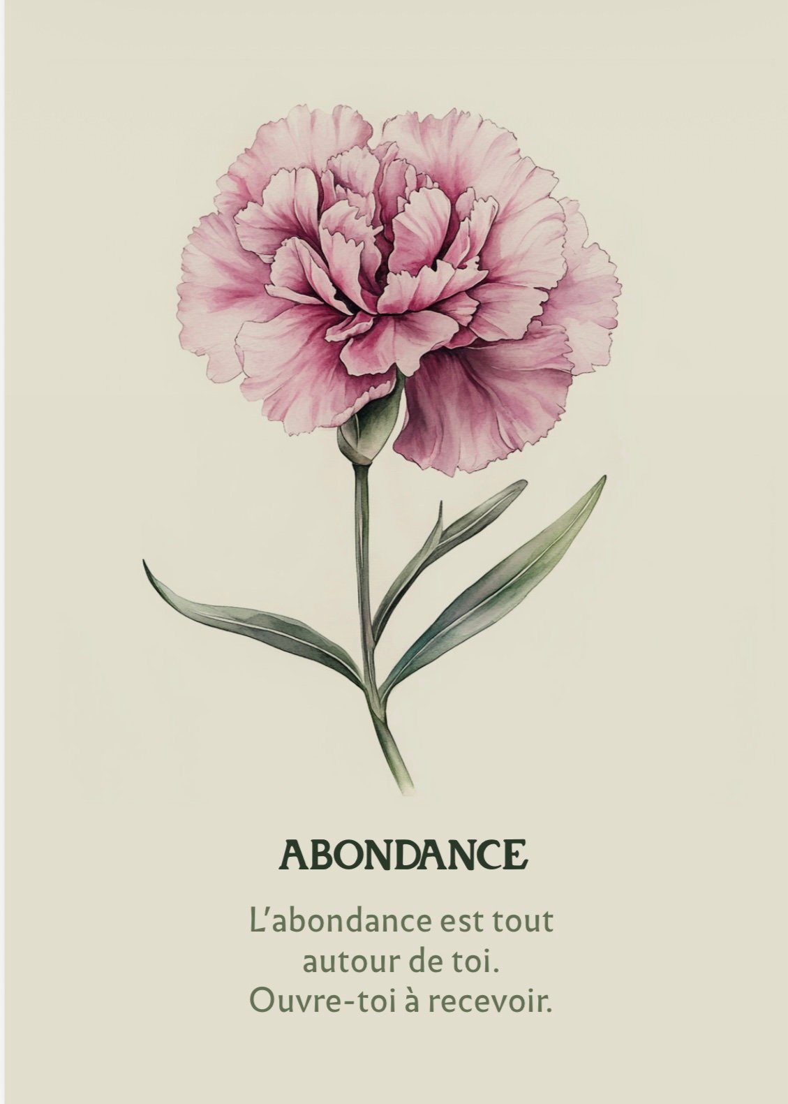 Variété généreuse, l’œillet des fleuristes symbolise l’ouverture au don, à l’abondance matérielle et affective. Cette carte vous invite à reconnaître que l’abondance est tout autour de vous et à accueillir ce que la vie vous offre.