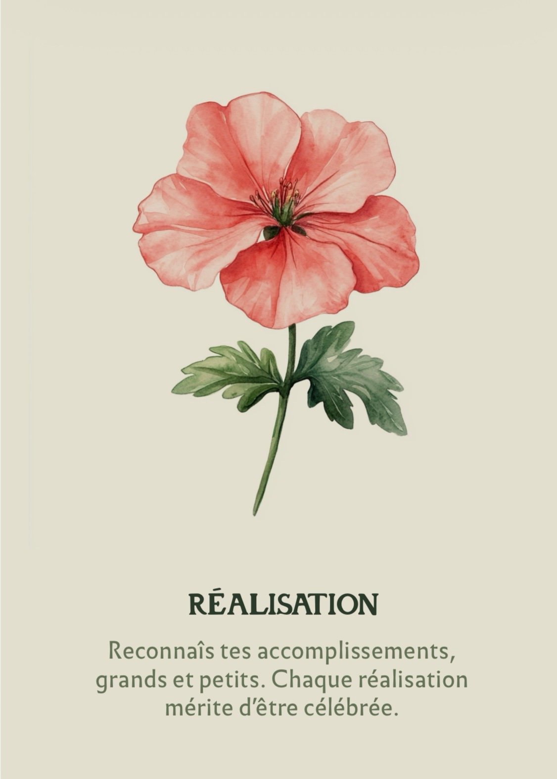 Fleur familière et solide, le géranium symbolise les petits pas accomplis, la fierté de ce qui a été semé puis récolté. Cette carte célèbre vos accomplissements, grands et petits, vous encourageant à reconnaître le chemin parcouru.